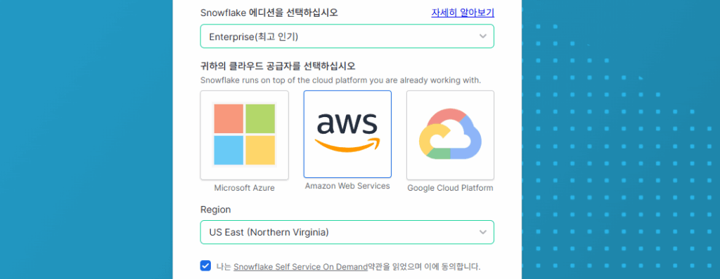 Snowflake 계정을 생성하고 데이터를 연결하는 과정은 간단하지만, 매우 중요한 ‘함정’이 하나 있다. 바로 ‘리전(Region)‘이다. Snowflake 계정은 생성 시 특정 클라우드(AWS, Azure, GCP)의 특정 리전(예: AWS의 US East (N. Virginia))을 선택해야 하며, 한번 생성된 계정의 리전은 변경할 수 없다.
