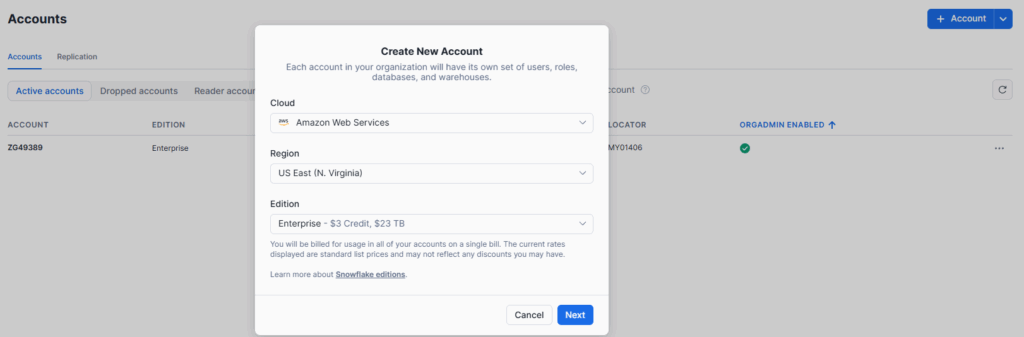 Manage – Admin – Accounts에서 접근해서 지역 및 정보를 변경한 계정을 새로 만들 수 있으나 이 방법으로는 400크리딧은 옮길 수 없다.. snowflake의 warehouse를 사용하기에 비용 발생이되니 계정을 다시 만들기로 결심한다! ㅜㅜ 꼭 사용전에 원하는 데이터의 지역 및 환경 스펙 확인해보자!