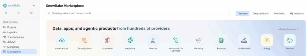- 데이터 마켓플레이스: 이 ‘데이터 공유’ 기능을 기반으로, 수많은 서드파티 데이터 제공자가 자사의 데이터를 상품으로 올려놓은 곳이 바로 Snowflake Marketplace다. 온체인 데이터(Amberdata , Flipside )뿐만 아니라, 날씨, 금융, 마케팅, 지리 정보 등 다양한 오프체인 데이터를 이곳에서 찾아 즉시 결합할 수 있다.