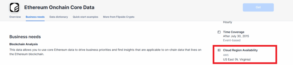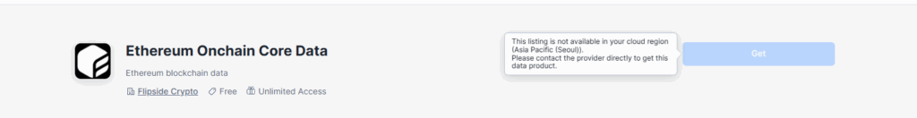 계정 생성 완료 후 데이터를 사용하기 위해서는 MARKET PLACE에서 데이터를 연결해야한다. 이동 경로는 Work with data – Marketplace으로 접근 가능하며 이 곳에서 키워드 검색을 통해 원하는 데이터를 연결할 수 있다. Flipside Crypto의 데이터분석을 위해 접근했으니 검색 후 원하는 데이터를 찾아서 Get버튼으로 활성화 시키면 된다. 하지만…
