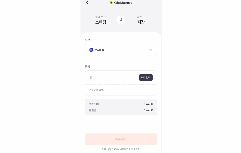 슈퍼워크에서 획득한 WALK 토큰은 기본적으로 스펜딩(Spending) 지갑에 보관된다. 스펜딩 지갑은 앱 내부에서만 사용할 수 있는 일종의 임시 지갑 공간으로, 실제 블록체인 외부 지갑과는 다르다. 쉽게 말해 게임 캐시처럼 앱 안에서만 쓰이는 잔고 개념이다. 따라서 토큰을 현금화하려면 먼저 스펜딩 지갑에 있는 WALK를 외부 지갑(예: MetaMask)으로 옮겨야 한다. 절차는 다음과 같다