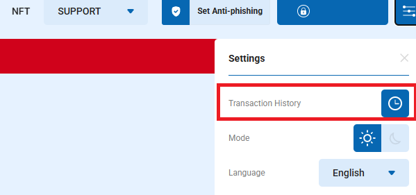 - 접속 방법: Orbit Bridge 웹 기준, 화면 우측 상단의 메뉴 버튼(≡) → Settings → Transaction History 클릭